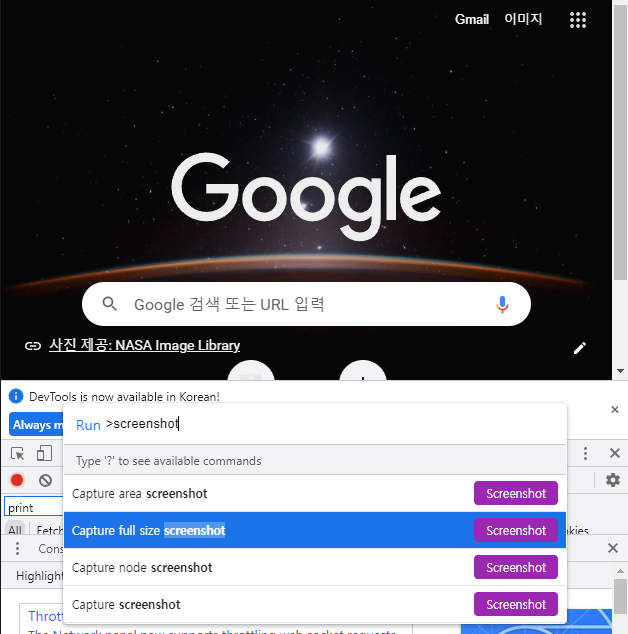 2. 브라우저 화면 캡처 : 크롬 F12개발자 도구 -> Ctrl + shift + P -> screenshot 검색